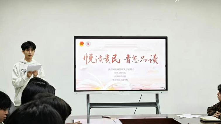 为厚植校园文化底蕴,搭建师生共读交流平台,引导青年学子在文字中品读人间烟火、汲取成长力量,2026年4月22日,贵州民族大学“悦读贵民 青葱品读”读书会第十四期在南校区A10-B208会议室成功举办。本次活动由化学工程学院主办,民族医药学院、生态环境工程学院协办,活动特邀化学工程学院团委副书记王吉兰老师、民族医药学院团委副书记杨雪峰老师、生态环境工程学院团委负责人孙中容老师及三个学院学生代表,一起在文字的共鸣中碰撞思想,在交流的暖意里传递初心。